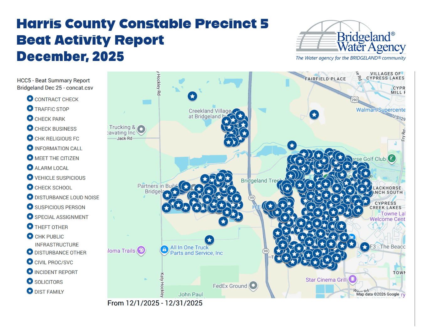 Bridgeland Water Agency (BWA) considers the safety and security of our community a top priority. We work closely with local law enforcement to ensure that our growing community remains a safe and welcoming place for all.