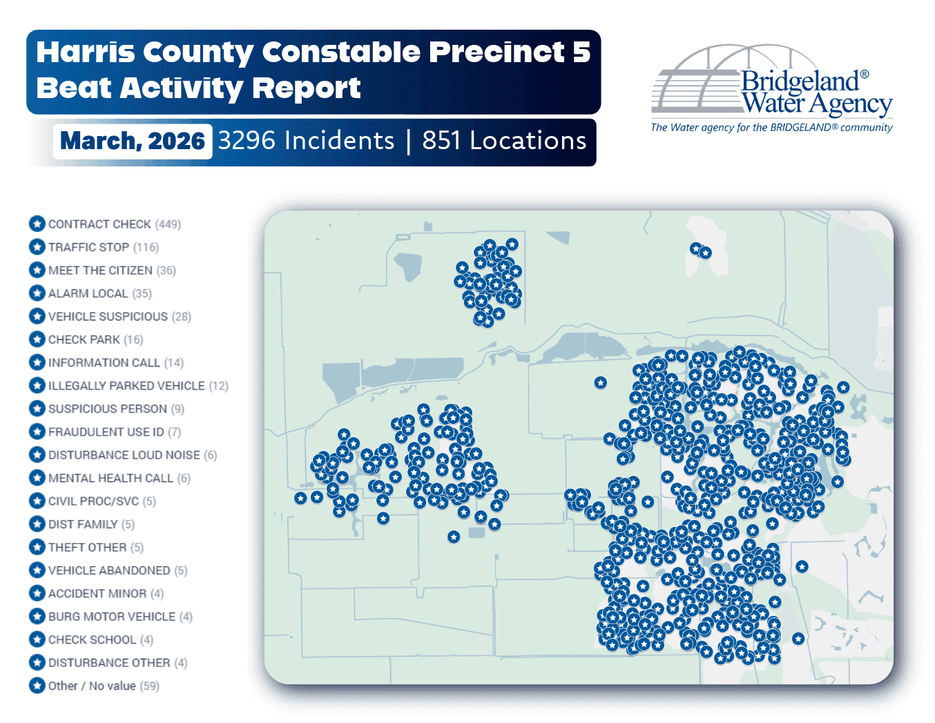 Local patrols, like the deputies assigned to Bridgeland through our contract with the Constable's Office, focus specifically on our neighborhoods. They provide faster response times, consistent visibility, and community-focused policing tailored to the needs of BWA residents.